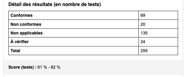Ainsi pour ce premier tableau, 106 critères sont évalués : 39 sont conformes, 18 sont possiblement conformes mais nécessitent une vérification manuelle. 15 critères ne sont pas conformes et nécessiteront des modifications au niveau de la page. Enfin, 33 critères ne sont pas applicables car aucun élément de cette page n'est concerné.
